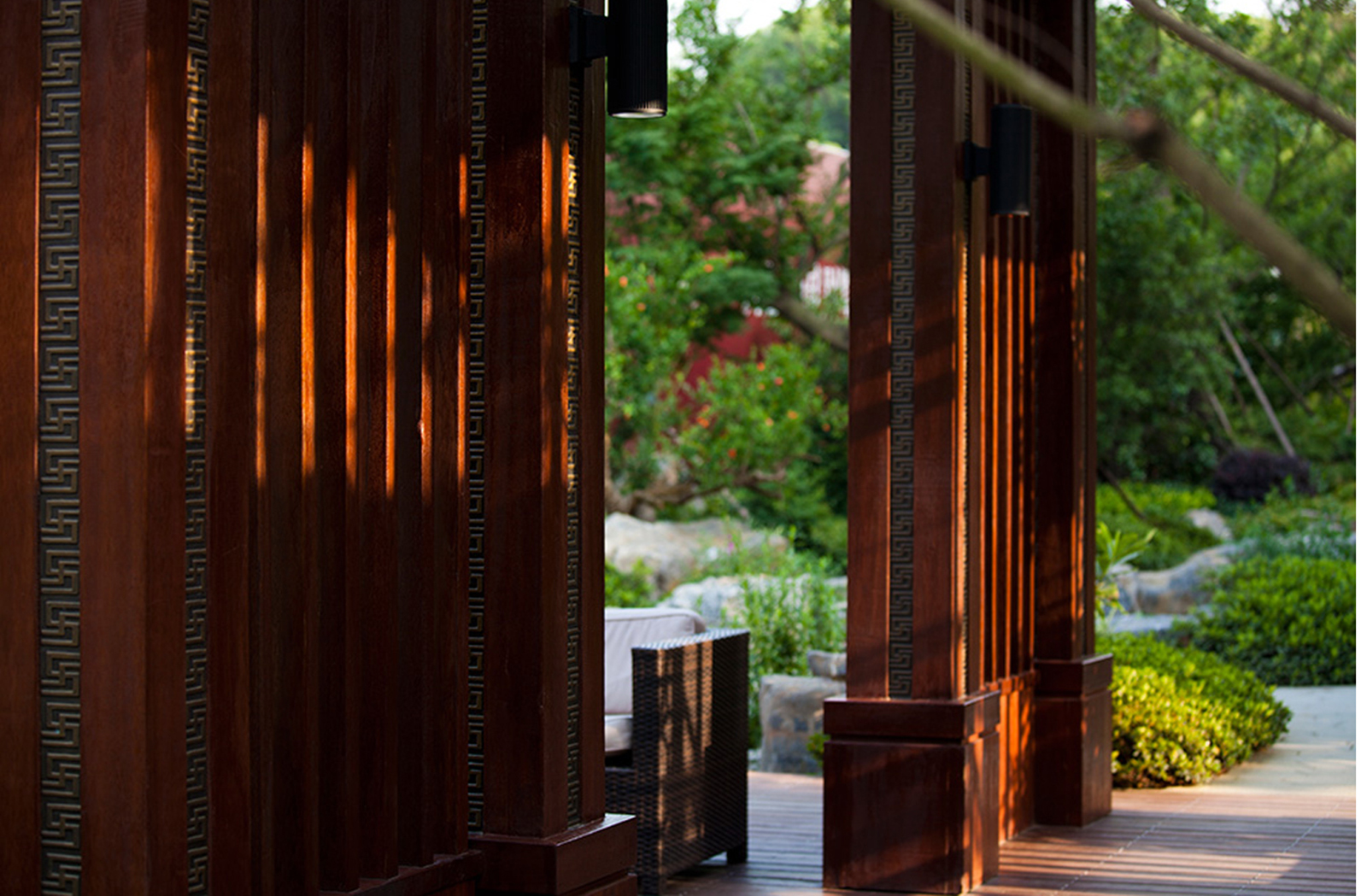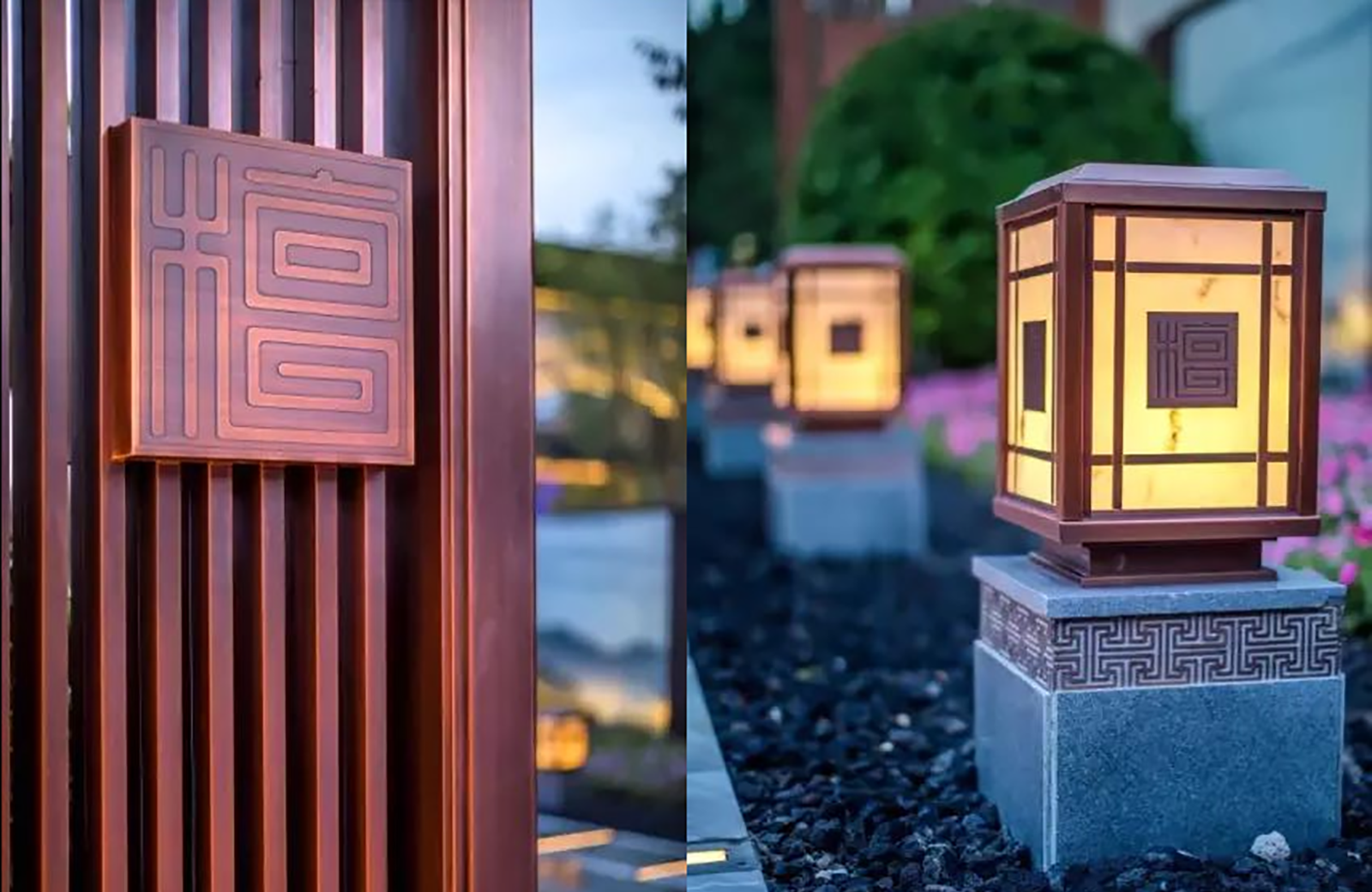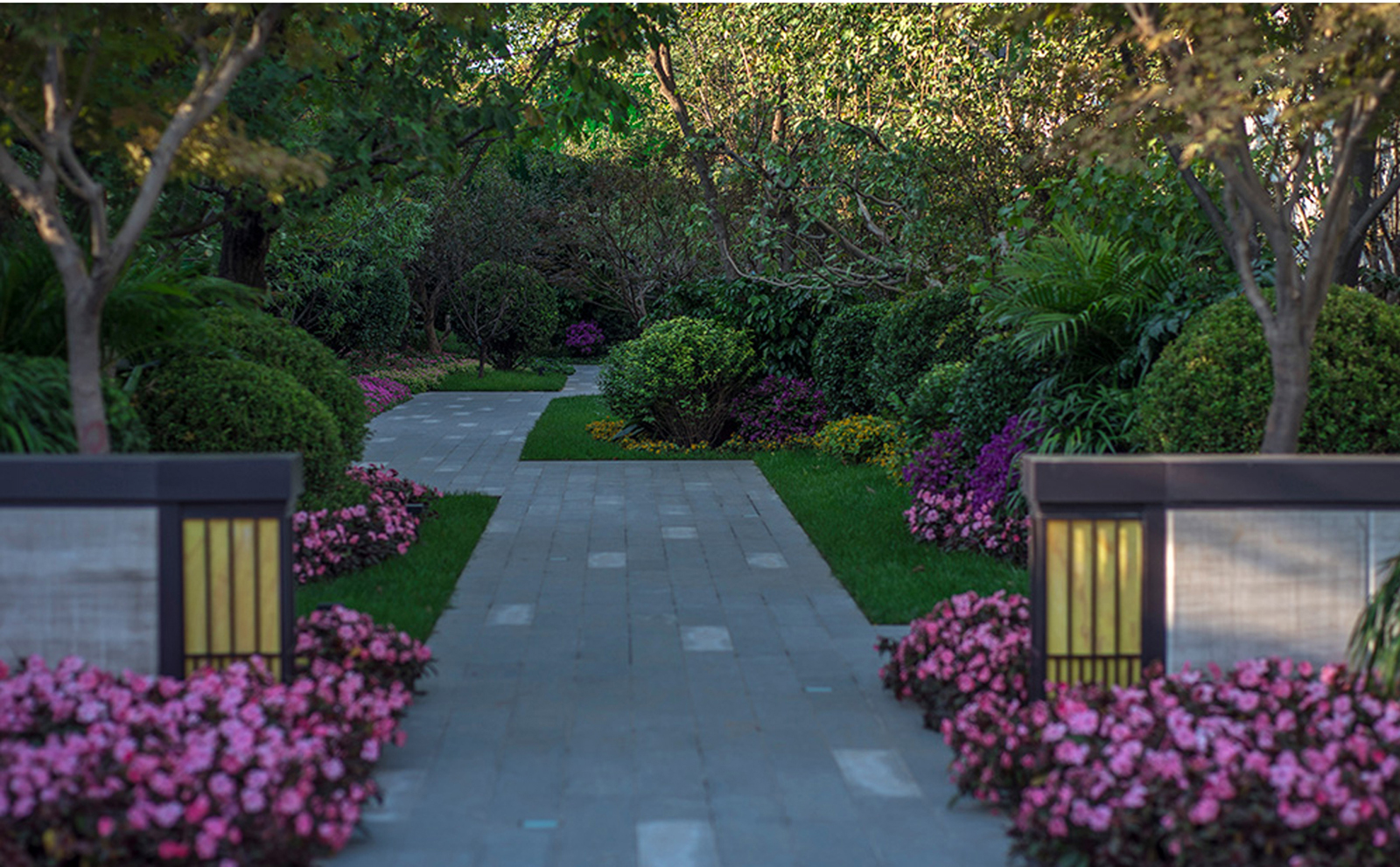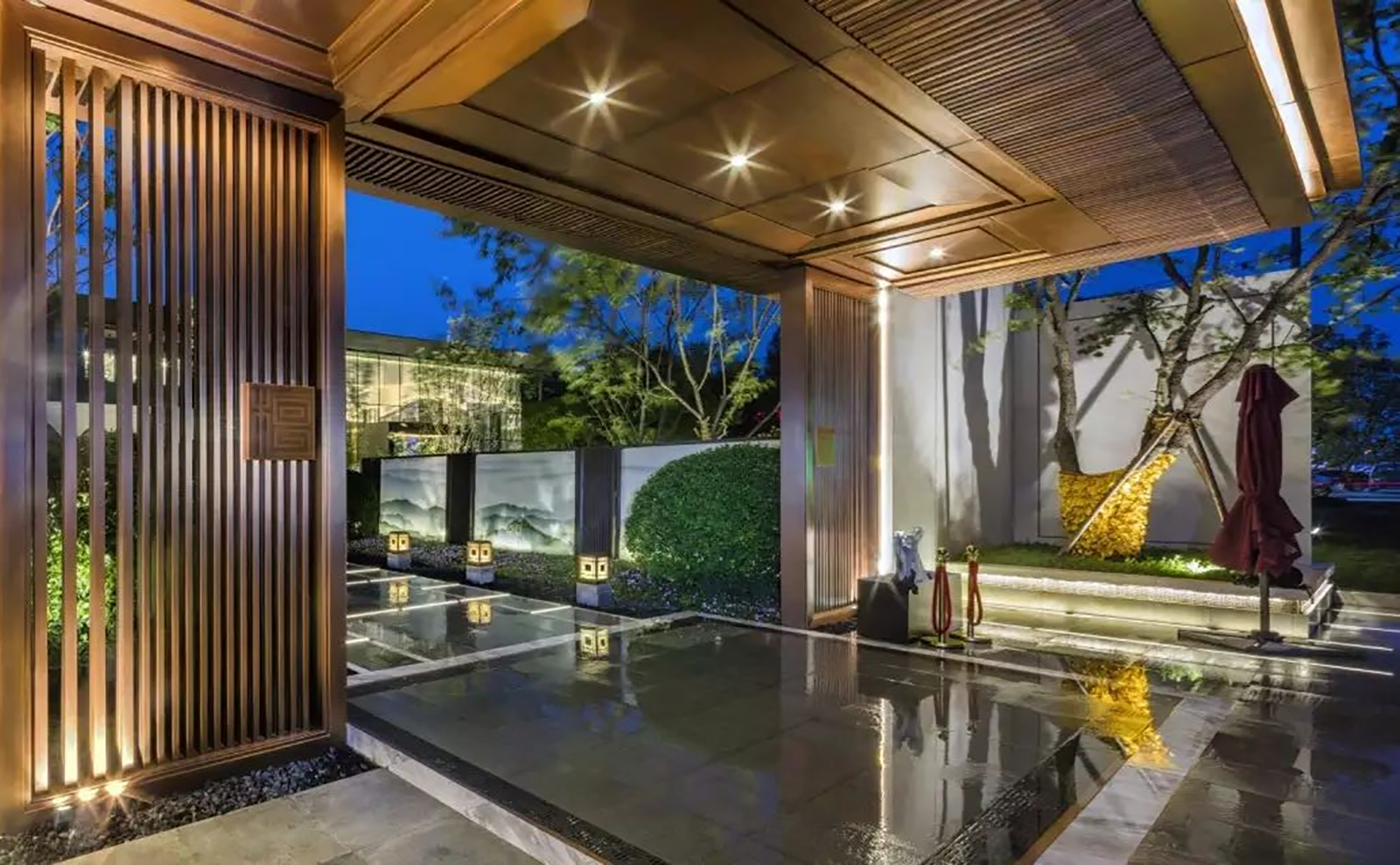 見禮檀園,府院初開,西入口門頭前場空間有限,景觀上采用 欲揚先抑的手法,以大禮東方、神韻在心為意境,將景觀在門頭后進一步表現(xiàn),空間組織人車分流,中軸步道以“檀” 字紋為核心,兩側以云入境,如焚檀香以籠煙,林蔭清淺,天色清雅,業(yè)主歸家自然心境平和。