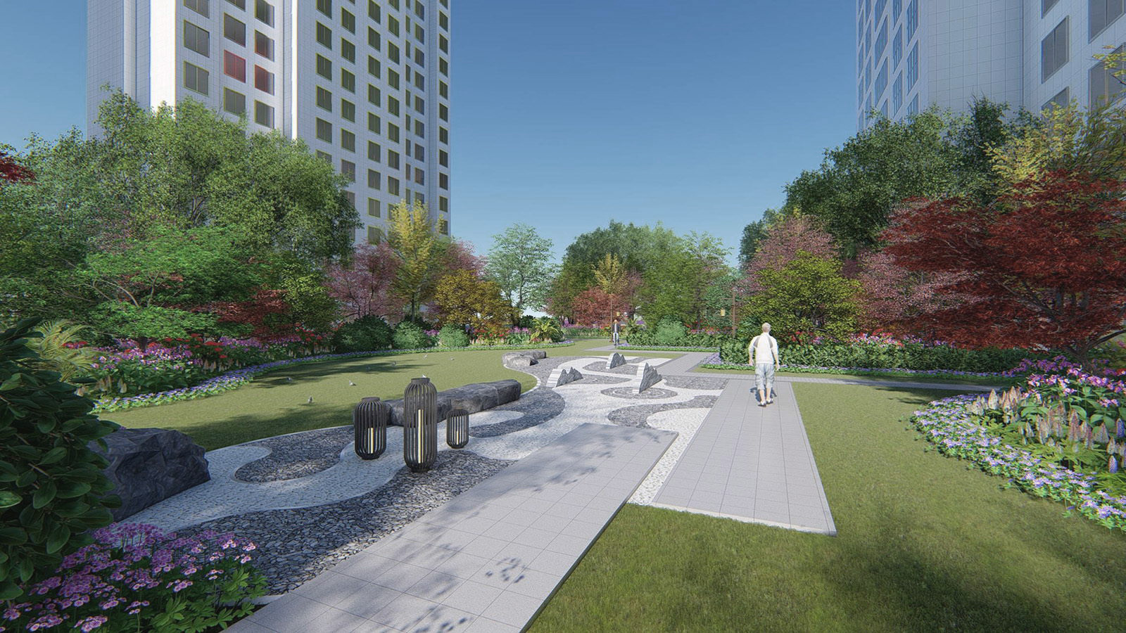以新中式簡約設計手法描繪出完美的幸福社區(qū)生活氛圍,滿足全齡段不同業(yè)主的生活功能需求,依據(jù)幸福主題,對不同區(qū)域的組團賦予不同的主題功能,打造三大地塊五大幸福主題花園盛景。