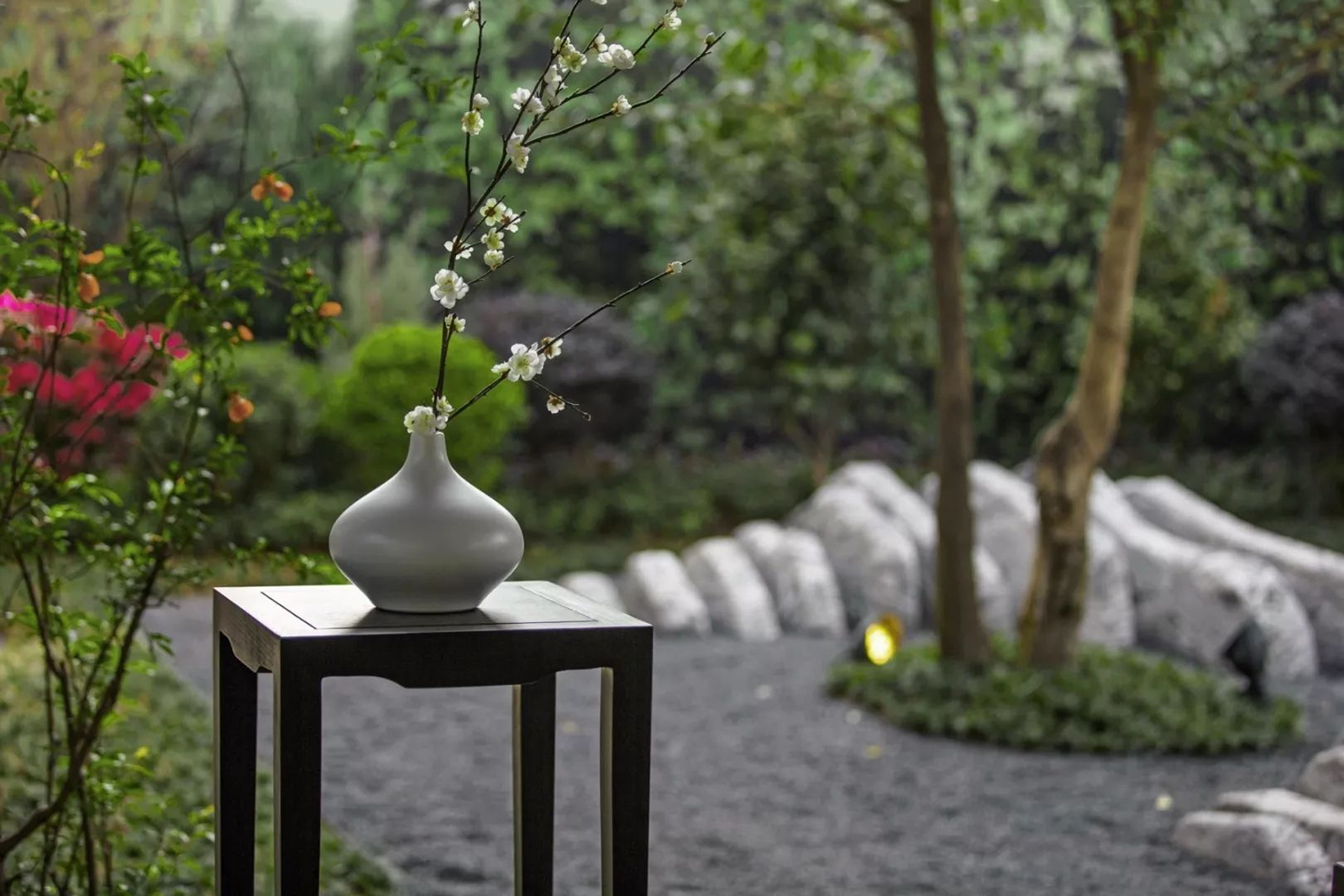 灰白砂石與草坡帶來的景觀明暗變化,縹緲云煙畫卷開,山峰染墨凈塵埃,山水畫卷之后呈現盛世華府清凈質感。白沙入霧綠島如云,砂石又可為砂庭出入路徑,又自成一道風景。