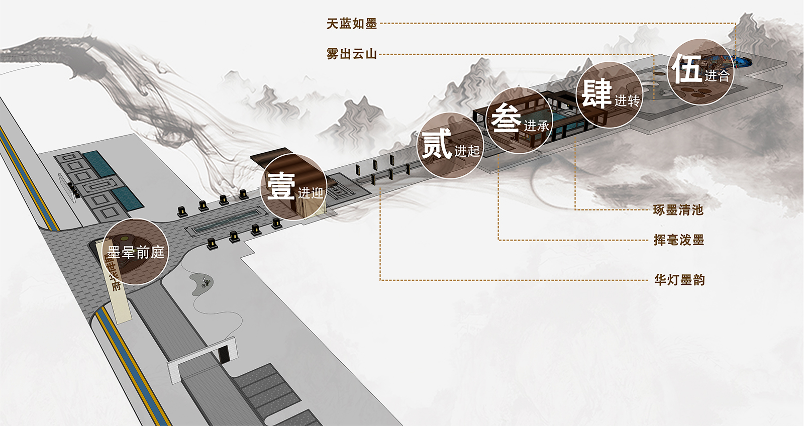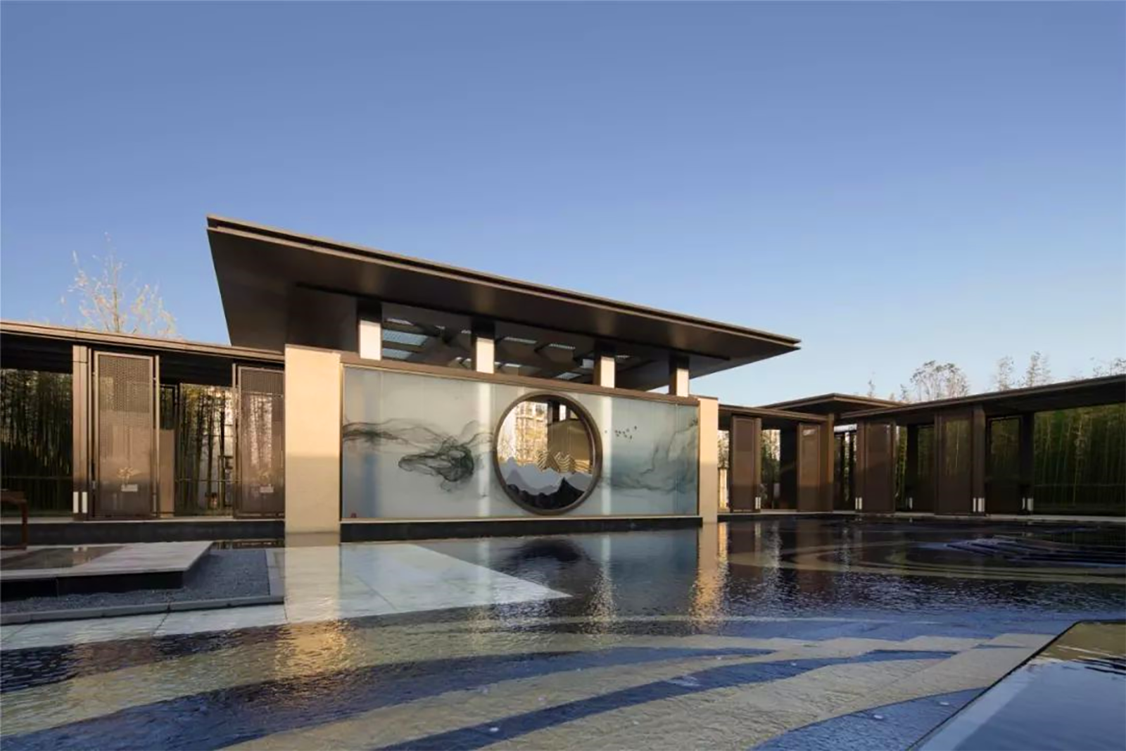 售樓處前場以硯石流墨為視覺焦點,黑色肌理猶如一方硯臺,水景層層疊疊,如水墨輕流,水墨文鋪裝如丹青一抹煙雨濃,墨香氤氳氣韻生,不只是宣紙上走筆才能暈染出水墨的虛幻與自由。