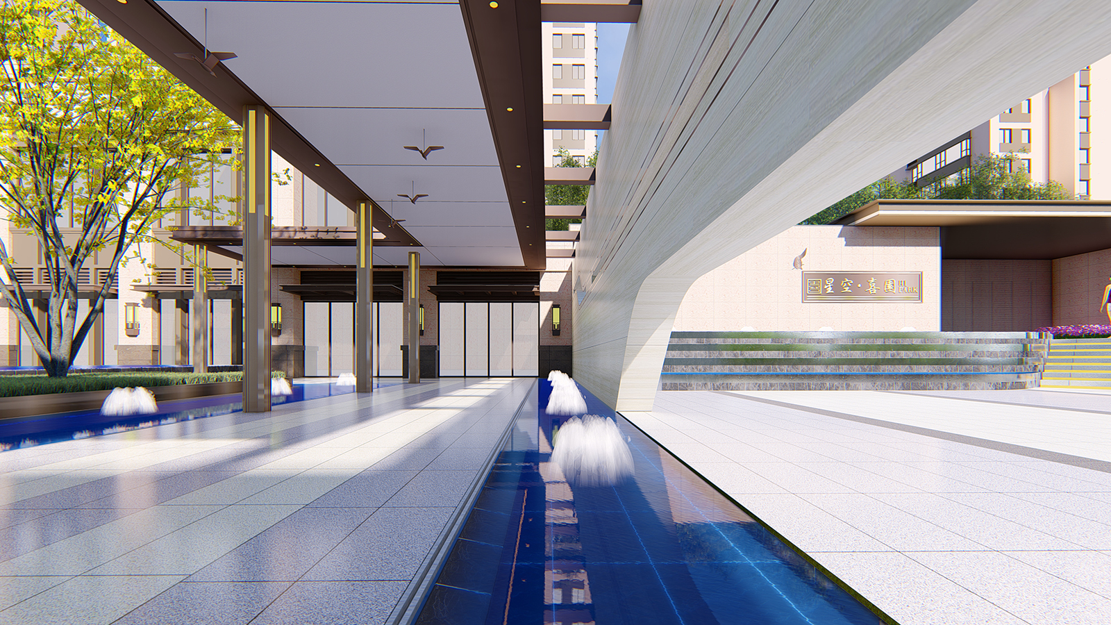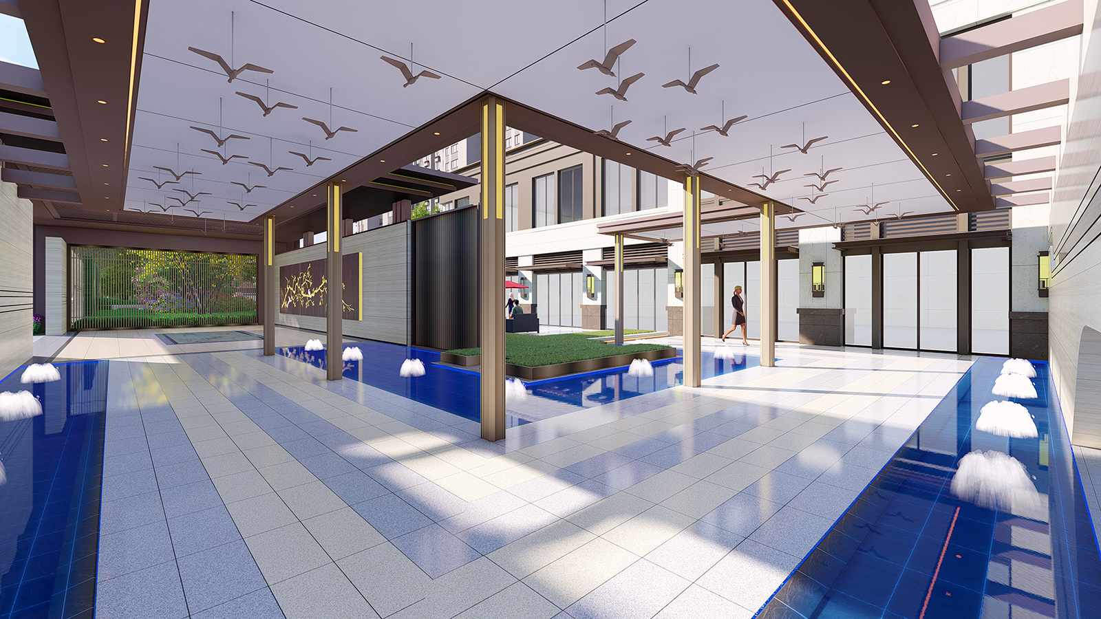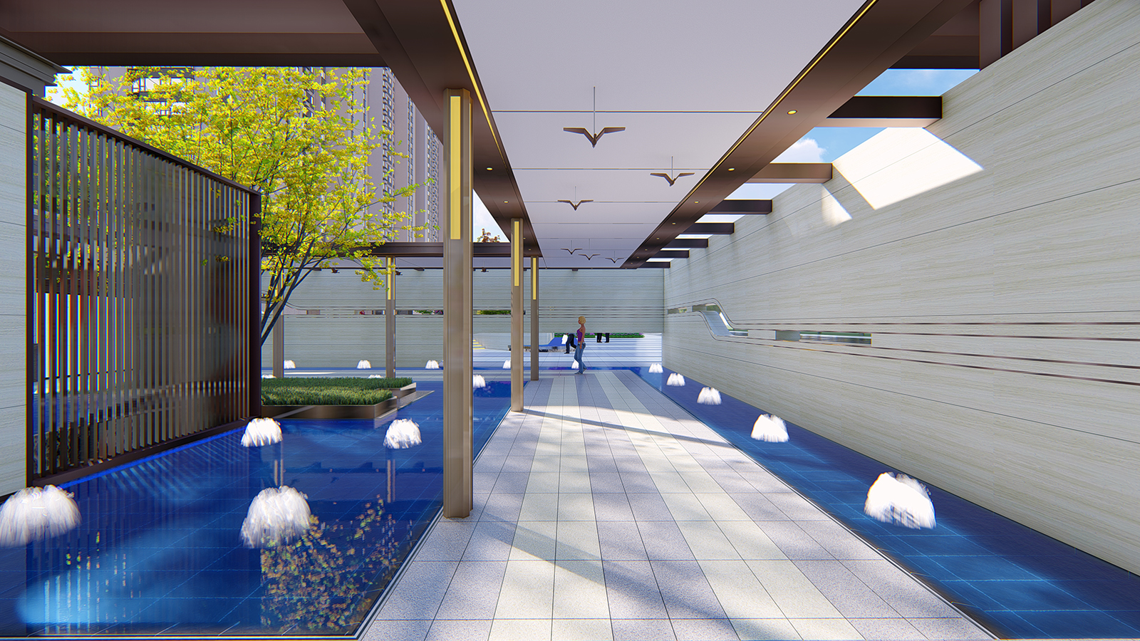 迎賓廣場平坦開闊,疊水水景與臺(tái)階組合現(xiàn)代、精致、優(yōu)雅,水景布置有鵲歸巢主題雕塑,禮迎業(yè)主歸家,彰顯小區(qū)尊享品質(zhì)。