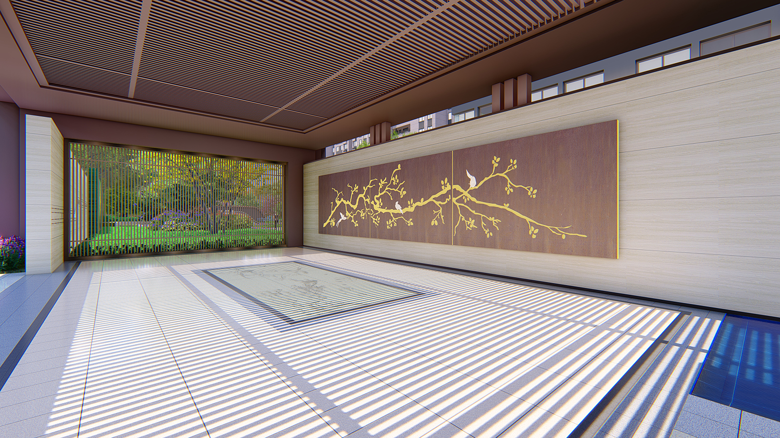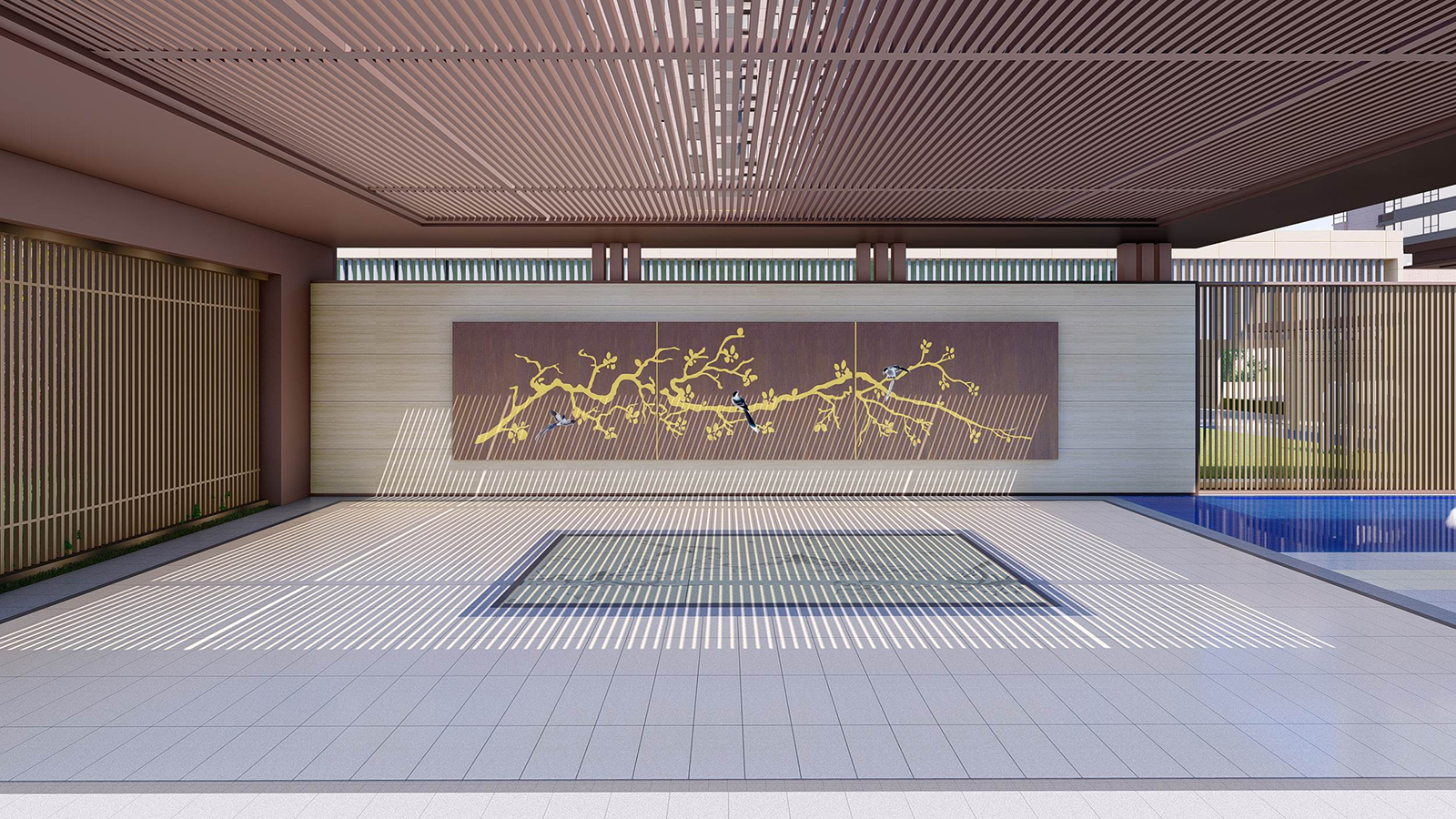 門頭對(duì)景處設(shè)置“喜上眉(梅)梢”景墻,客戶視線跟隨梅花枝條方向延伸,巧妙構(gòu)建空間遞進(jìn)關(guān)系,為項(xiàng)目增添趣味及內(nèi)涵。