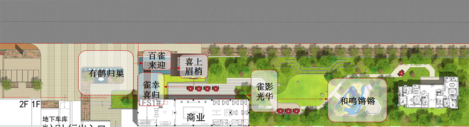售樓部走出后園路上的對(duì)景,設(shè)置鵲影光華異形格柵景墻,優(yōu)雅的光影關(guān)系,若隱若現(xiàn)的喜鵲小品,引導(dǎo)客戶進(jìn)入景觀后場空間。
